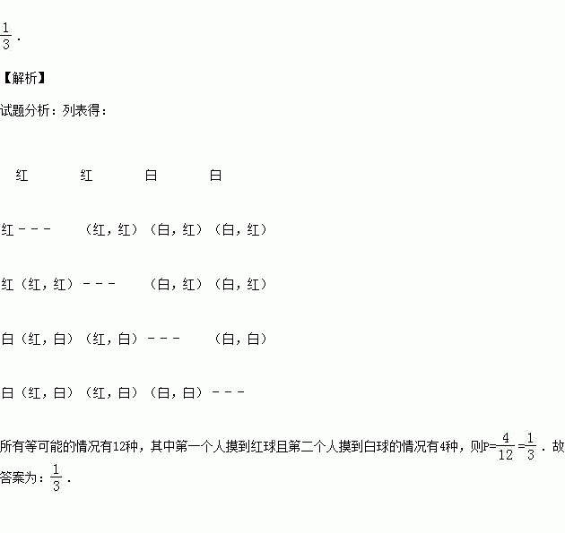 一个不透明的袋子中装有仅颜色不同的2个红球和2个白球,两个人依次从袋子中随机摸出一个小球不放回,则第一个人摸到红球且第二个人摸到白球的概率是____________.