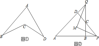 ②先由∠APD、∠AQB的平分线交于点M,得出∠AQM=∠BQM,∠APM=∠DPM.令∠AQM=∠BQM=α,∠APM=∠DPM=β.由(2)中的结论可知在镖形APMQ中,有∠A+α+β=∠PMQ,在镖形APCQ中,有∠A+2α+2β=∠QCP,于是根据等式的性质得出∠QCP+∠A=2∠PMQ,而∠A+∠QCP=180°,那么∠PMQ=90°,即PM⊥QM.