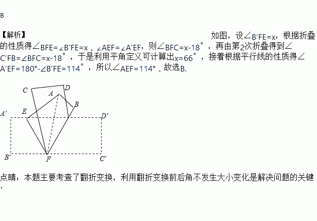 如图1是AD∥BC的一张纸条,按图1→图2→图3,把这一纸条先沿EF折叠并压平,再沿BF折叠并压平,若图3中∠CFE=18°,则图2中∠AEF的度数为( )![]()