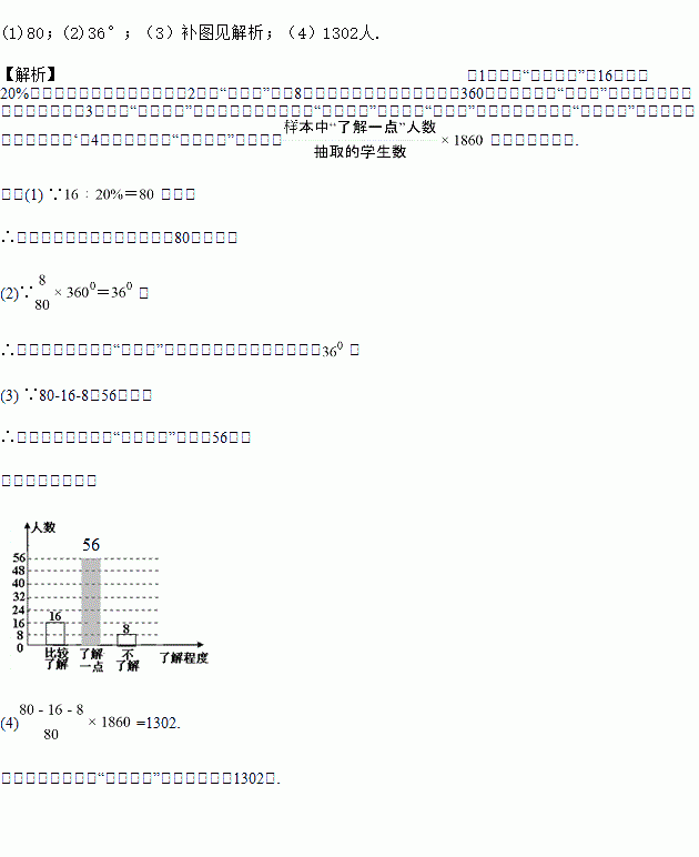 (4)Èô¸ÃУÓÐ1860ÃûѧÉú£¬¸ù¾Ýµ÷²é½á¹û£¬Çë¹ÀËã³ö¶ÔÆÕ¶ý²è֪ʶ¡°Á˽âÒ»µã¡±µÄѧÉúÈËÊý.