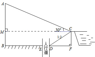 城市规划期间,欲拆除一电线杆AB,已知距电线杆AB水平距离14m的D处有一大坝,背水坡CD的坡度i=1:2,坝高CF为2m,在坝顶C处测得杆顶A的仰角为30°,D、E之间是宽为2m的人行道.