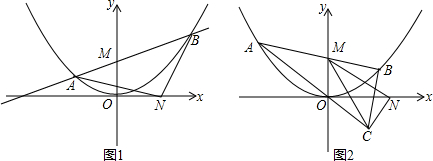 2.如图1,动直线l:y=kx+2交抛物线y=$\frac{1}{4}$x2于A、B两点(A在B的左边),交y轴于M点,N为x轴正半轴上一点,且ON=OM+1