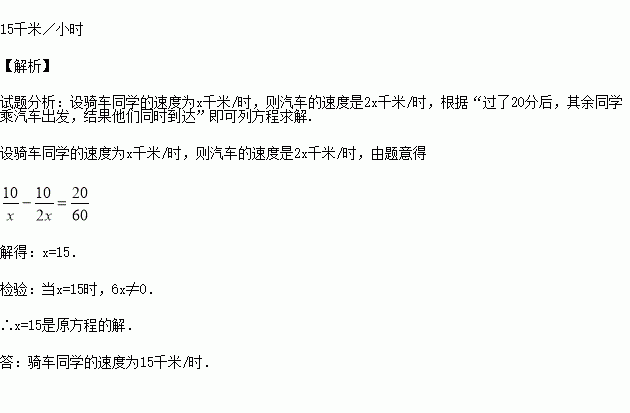 八年级学生去距学校10千米的博物馆参观,一部分学生骑自行车先走,过了20分钟后,其余学生乘汽车出发,结果他们同时到达。已知汽车的速度是骑车学生速度的2倍,求骑车学生的速度。