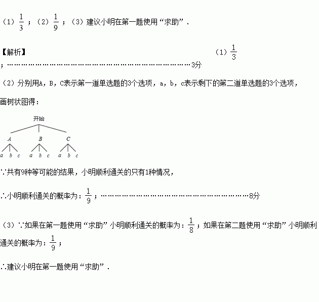 (2)如果小明将“求助”留在第二题使用,请用树状图或者列表来分析小明顺利通关的概率.