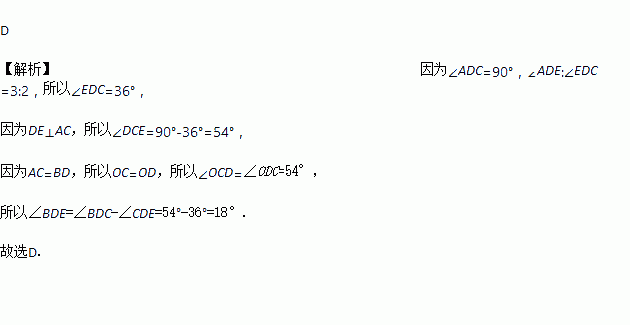 如图,矩形ABCD中,DE⊥AC于E,且∠ADE:∠EDC=3:2,则∠BDE的度数为( )