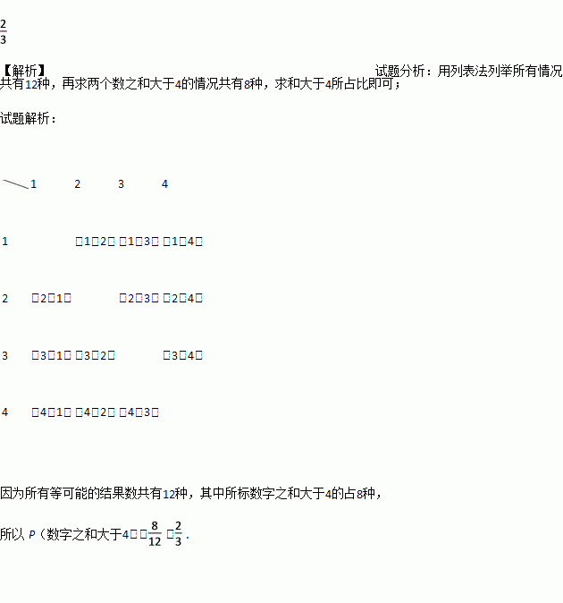 一个不透明的口袋中装有四个完全相同的小球,把它们分别标号为1,2,3,4.从袋中随机摸出一只小球,再从剩下的小球中随机摸出一只小球,请用列表法或画树形图的方法,求两次摸出的小球上所标数字之和大于4的概率.