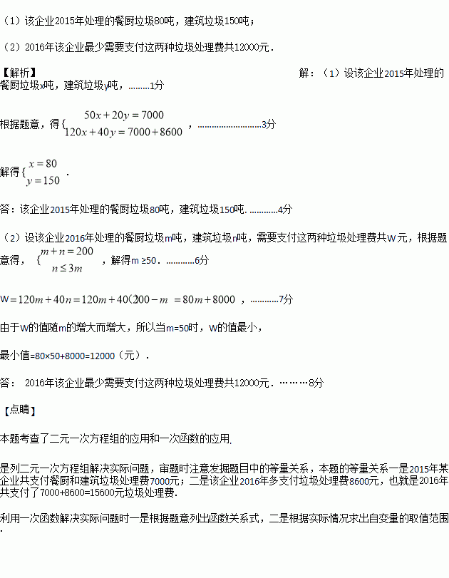 2015年某企业按餐厨垃圾处理费50元/吨、建筑垃圾处理费20元/吨的收费标准,共支付餐厨和建筑垃圾处理费7000元.从2016年元月起,收费标准上调为:餐厨垃圾处理费120元/吨,建筑垃圾处理费40元/吨.若该企业2016年处理的这两种垃圾数量与2015年相比没有变化,就要多支付垃圾处理费8600元.