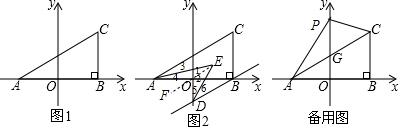(2)由于CB∥y轴,BD∥AC,则∠CAB=∠ABD,即∠3+∠4+∠5+∠6=90°,过E作EF∥AC,则BD∥AC∥EF,然后利用角平分线的定义可得到∠3=∠4=∠1,∠5=∠6=∠2,所以∠AED=∠1+∠2=$\frac{1}{2}$×90°=45°;