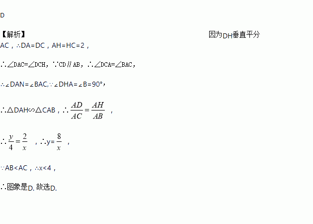 在四边形ABCD中,∠B=90°,AC=4,AB∥CD,DH垂直平分AC,点H为垂足.设AB=x,AD=y,则y关于x的函数关系用图象大致可以表示为( )