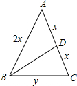 设等腰三角形的腰长AB=AC=2x,BC=y,