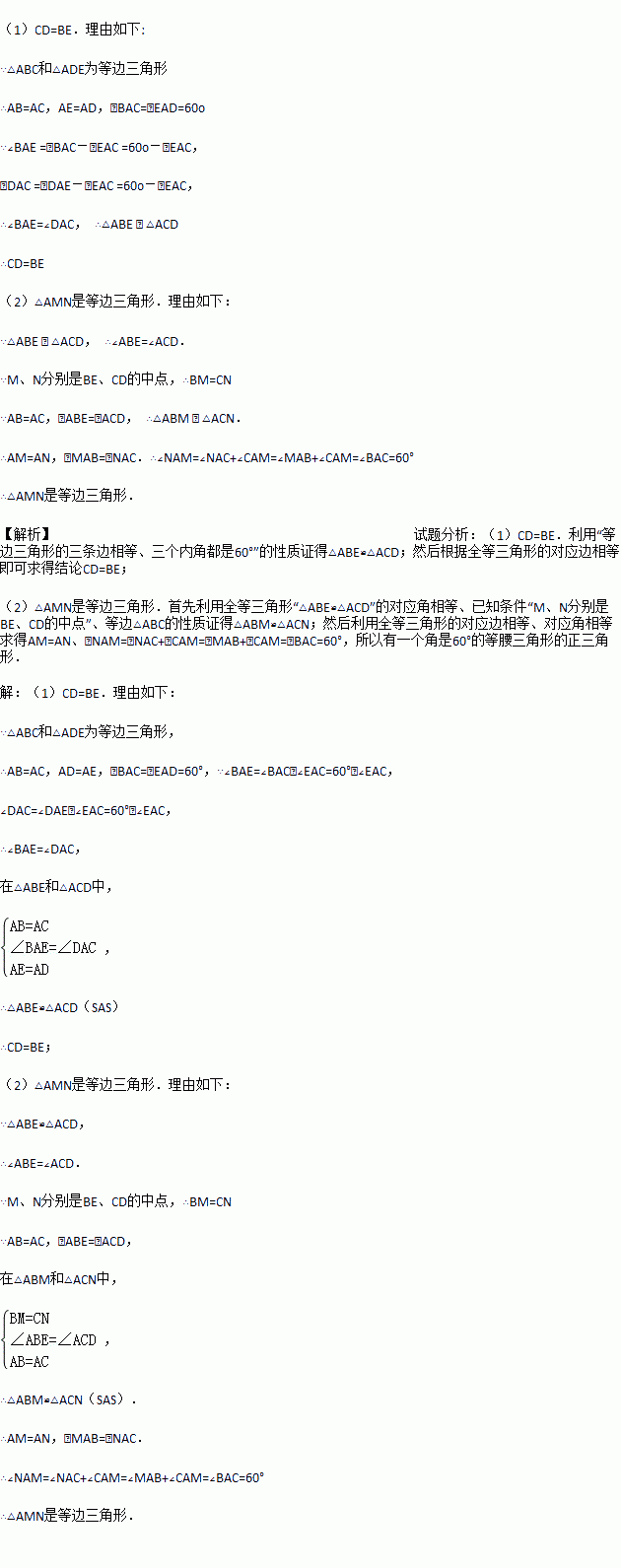 如图,若△ABC和△ADE为等边三角形,M,N分别EB,CD的中点,易证:CD=BE,△AMN是等边三角形.