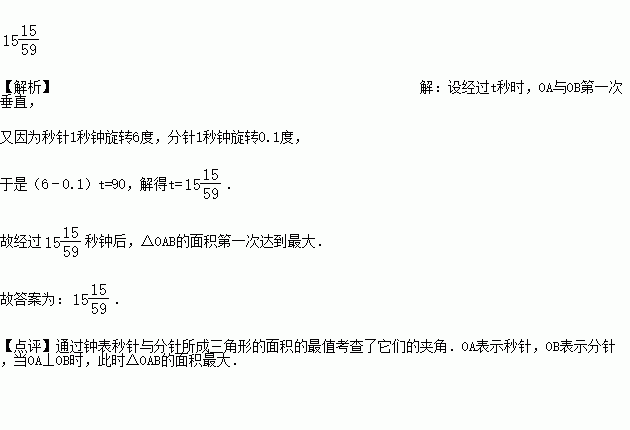 在一个圆形时钟的表面,OA表示秒针,OB表示分针(O为两针的旋转中心)若现在时间恰好是12点整,则经过 秒钟后,△OAB的面积第一次达到最大.