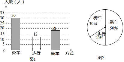 (2)求得步行的人数=60-30-18=12人,乘车的人数所对的圆心角的度数为360°×$\frac{30}{60}$=180°,骑车的人数所对的圆心角的度数为360°×$\frac{12}{60}$=72°,补全条形统计图和扇形统计图即可;