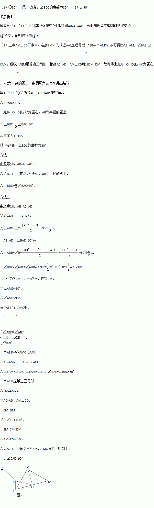 (2)如图2,以AB为斜边作直角三角形ABE,使得∠B=∠ACD,连接CE,DE.若∠CED=90°,求α的值.