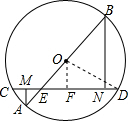 分析 (1)过O作OF⊥CD于F,利用平行线等分线段定理得到MF=NF,利用垂径定理得到:CF=NF,即可得到结论;(2)设AB与CD相交于E,利用垂径定理可以算出OF=3,设OE=x,则EB=x+5,AE=5-x,利用△EBN∽△EOF得到BN:3=(5+x):x,利用△AME∽△OFE得到AM:3=(5-x):x,两式相减即可得到:(BN-AM):3=2,从而得到答案.