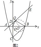 ∴以OB为直径的圆与直线AE相切于点Q,圆心记为O′,连接O′Q,如图2,![]()