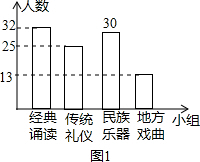 分析 (1)用地方戏曲的人数除以其所占的百分比即可求得总人数,减去其它小组的频数即可求得民族乐器的人数,从而补全统计图;