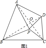 分析 (1)连接AC、BD,如图1,由△PAB和△PCD都是等腰直角三角形,可证得△BPD≌△APC,根据全等三角形的性质可得AC=BD,∠PBD=∠PAC,从而可得∠AOB=∠APB=90°,然后运用勾股定理就可证得AB2+CD2=AD2+BC2.过点C作CF⊥BP,交BP的延长线于F,过点D作DE⊥AP于E,如图2,不妨设AB=m,CD=n,∠APD=α,根据同角的余角相等可得∠FPC=∠APD=α,然后运用三角函数表示出△APD和△BPC的高,就可得到△APD和△BPC的面积相等;