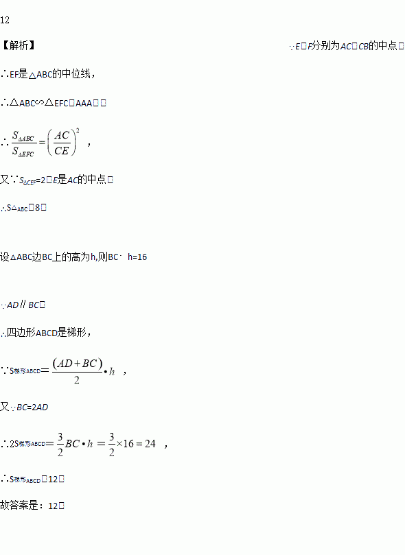 如图四边形ABCD中,AD∥BC,连接AC,E、F分别为AC、CB的中点,BC=2AD,SΔCEF=2,四边形ABCD的面积为_____________.