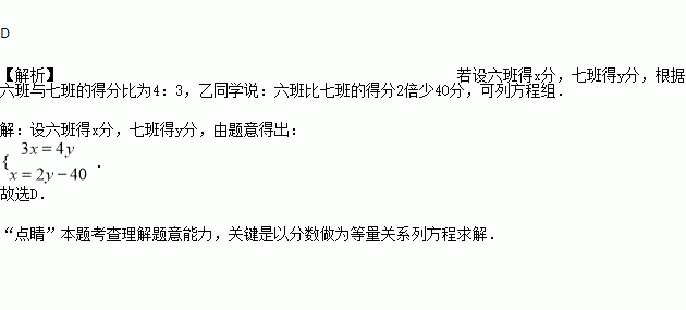某校春季运动会比赛中,七年级六班和七班的实力相当,关于比赛结果,甲同学说:六班与七班的得分比为4:3,乙同学说:六班比七班的得分2倍少40分,若设六班得x分,七班得y分,则根据题意可列方程组( )