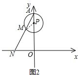 分析 (1)当m=$\frac{1}{4}$时,连接PM,如图1,点M从点A绕着点P逆时针旋转了一周的$\frac{1}{4}$,从而可得到旋转角∠APM为90°,根据PA=PM可得∠PAM=∠PMA=45°,则有NO=AO=1,即可得到n=-1;
