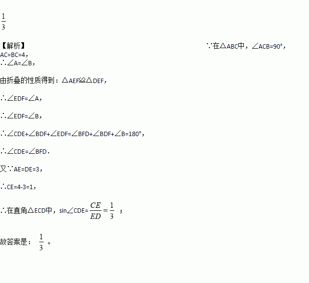 如图,在△ABC中,∠ACB=90°,AC=BC=4,将△ABC折叠,使点A落在BC边上的点D处,EF为折痕,若AE=3,则sin∠BFD的值为_______.