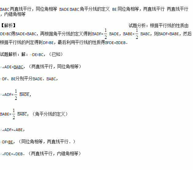 如图,已知DE∥BC,DF、BE分别平分∠ADE、∠ABC,可推得∠FDE=∠DEB的理由: