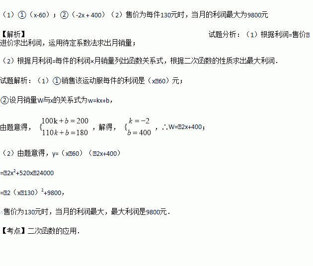 (2)设销量该运动服的月利润为y元,那么售价为多少时,当月的利润最大,最大利润是多少?