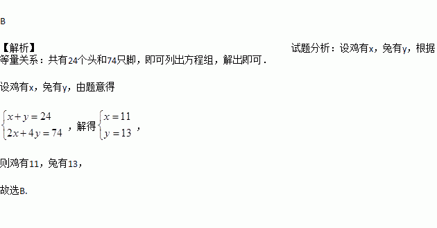 今有鸡兔若干,它们共有24个头和74只脚,则鸡兔各有( )