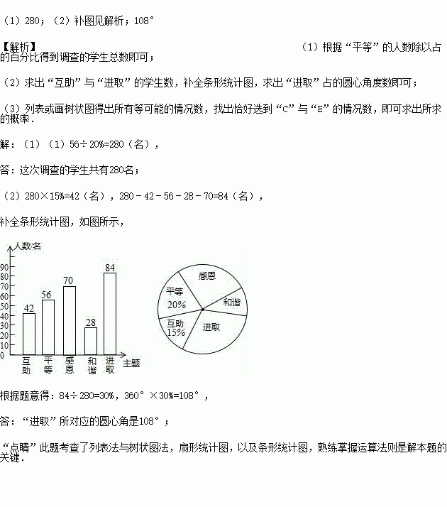 某校开展了“互助、平等、感恩、和谐、进取”主题班会活动,活动后,就活动的5个主题进行了抽样调查(每位同学只选最关注的一个),根据调查结果绘制了两幅不完整的统计图.根据图中提供的信息,解答下列问题: