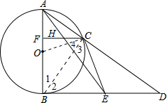 分析 (1)根据切线的性质得AB⊥BD,而CF⊥AB,所以CF∥BD,根据相似的判定方法得△AFH∽△ABE,△AHC∽△AED,利用相似的性质得$\frac{FH}{BE}$=$\frac{AH}{AE}$,$\frac{CH}{DE}$=$\frac{AH}{AE}$,所以$\frac{FH}{BE}$=$\frac{CH}{DE}$,而BE=DE,则FH=CH;