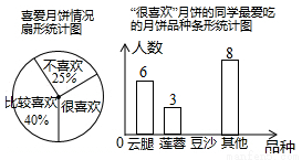 (1)扇形统计图中,“很喜欢”的部分所对应的圆心角为 度;条形统计图中,“很喜欢”月饼中喜欢“豆沙”月饼的学生有 人;