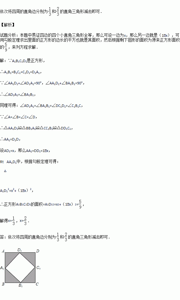 如图,若把边长为1的正方形ABCD的四个角(阴影部分)剪掉,得一四边形A1B1C1D1.试问怎样剪,才能使剩下的图形仍为正方形,且剩下图形的面积为原来正方形面积的