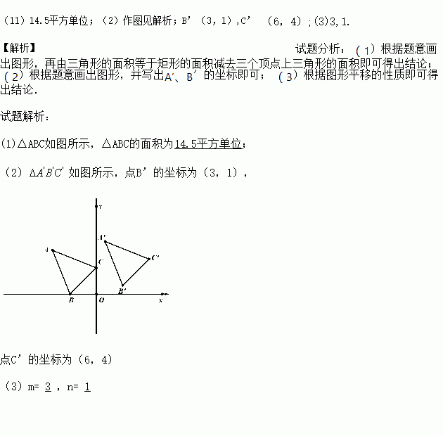 (2)在△ABC中,点C经过平移后的对应点为C′(5,4),将△ABC作同样的平移得到△A′B′C′, 画出平移后的△A′B′C′,并写出点A′,B′的坐标;