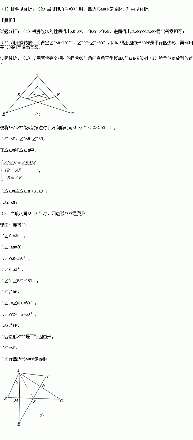 某校九年级学习小组在探究学习过程中,用两块完全相同的且含60°角的直角三角板ABC与AFE按如图(1)所示位置放置放置,现将Rt△AEF绕A点按逆时针方向旋转角α(0°<α<90°),如图(2),AE与BC交于点M,AC与EF交于点N,BC与EF交于点P.