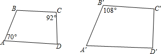 如图,四边形ABCD∽四边形A′B′C′D′,∠A=70°,∠C=92°,∠B′=108°,则∠D′=