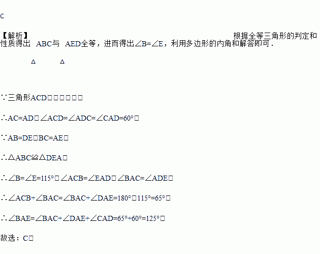 如图,五边形ABCDE中有一正三角形ACD,若AB=DE,BC=AE,∠E=115°,则∠BAE的度数为何?( )
