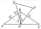 (3)取AB得中点G,连接OG,根据直角三角形的中线定理,及30°的直角三角形的性质,证得OQ=OB,根据∠GOB=∠MON=60°,证得∠GOM=∠NOB,根据全等三角形的判定,即可证明GM=BN,即可证得BM、BN、AB的关系.