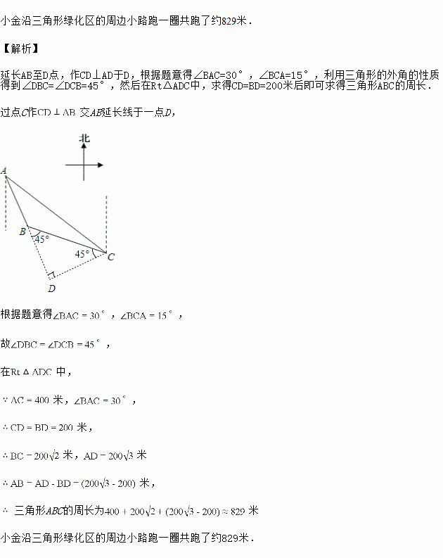 方向上,AC间距离为400米问小金沿三角形绿化区的周边小路跑一圈共跑了多少米?![]()