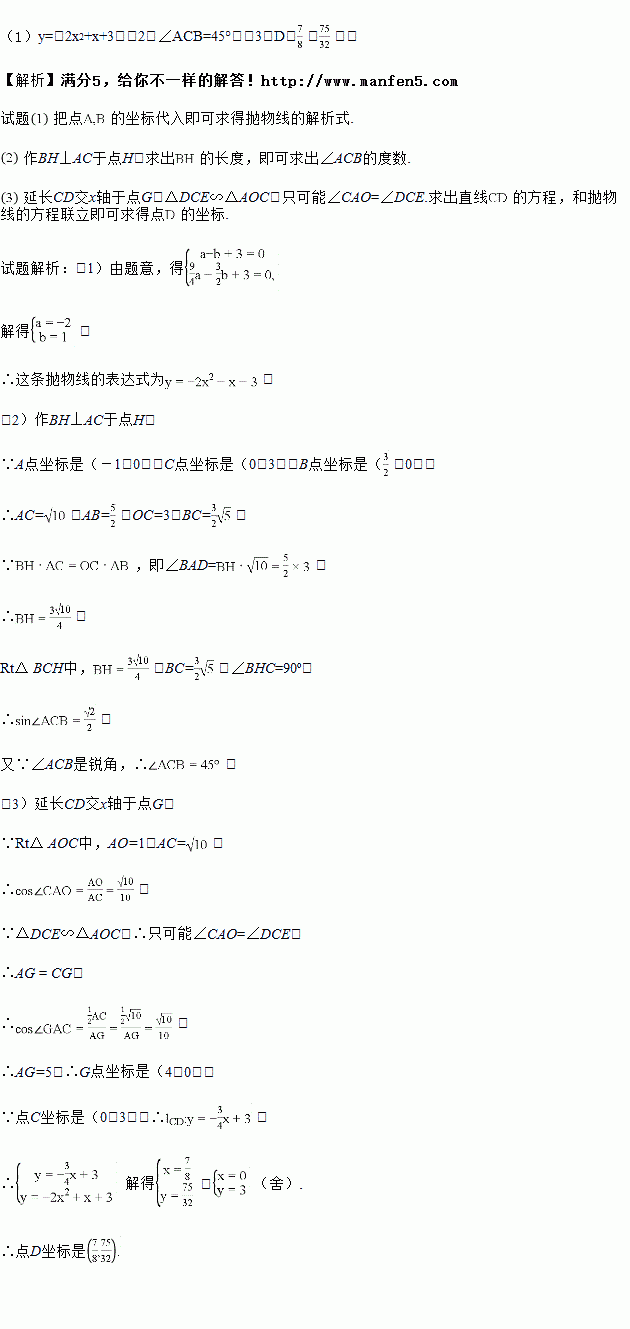(3)设点D是所求抛物线第一象限上一点,且在对称轴的右侧,点E在线段AC上,且DE⊥AC,当△DCE与△AOC相似时,求点D的坐标.