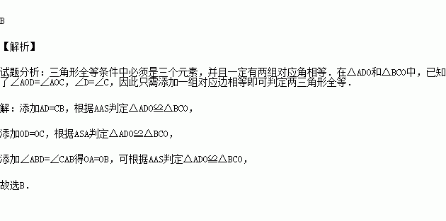 (2015秋•阳新县期末)如图,AC与BD相交于点O,∠D=∠C.添加下列哪个条件后,仍不能使△ADO≌△BCO的是( )