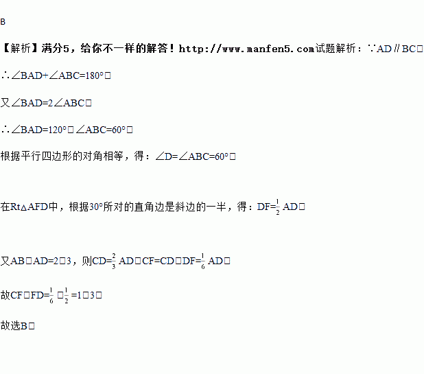 如图,平行四边形ABCD中,AE⊥BC,AF⊥DC,AB:AD=2:3,∠BAD=2∠ABC,则CF:FD的结果为( )