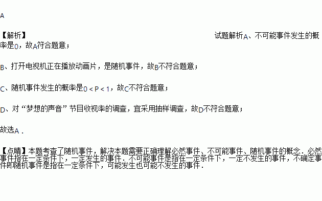 A. 不可能事件发生的概率是0 B. 打开电视机正在播放动画片,是必然事件