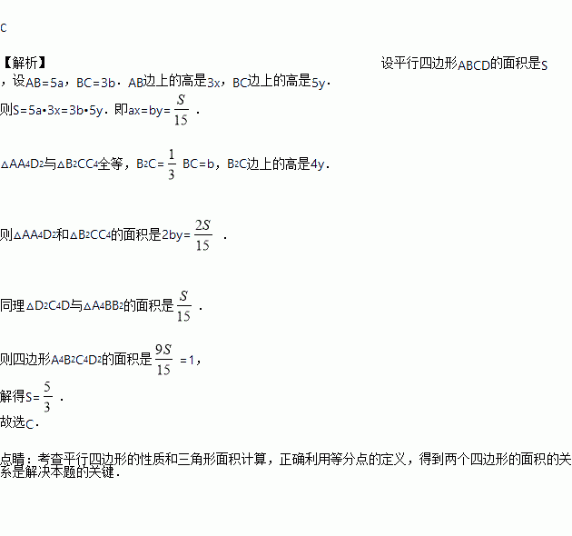 在平行四边形ABCD中,点A1,A2,A3,A4和C1,C2,C3,C4分别AB和CD的五等分点,点B1,B2和D1,D2分别是BC和DA的三等分点,已知四边形A4B2C4D2的面积为1,则平行四边形ABCD面积为( )