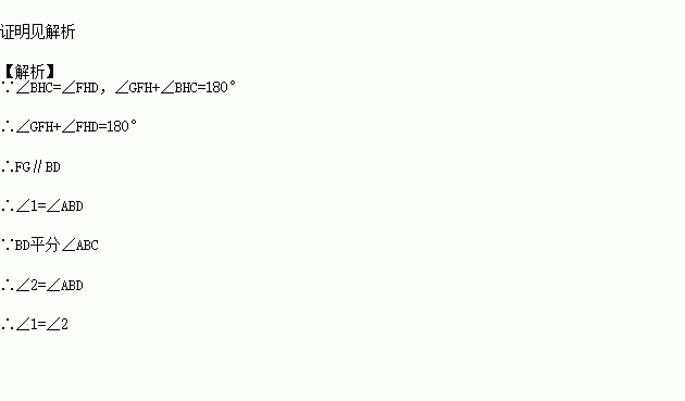如图,已知BD平分∠ABC,点F在AB上,点G在AC上,连接FG、FC,FC与BD相交于点H,如果∠GFH与∠BHC互补.求证:∠1=∠2.