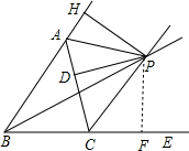 如图,△ABC中,∠B的平分线与∠C的外角的平分线交于P点,PD⊥AC于D,PH⊥BA于H,