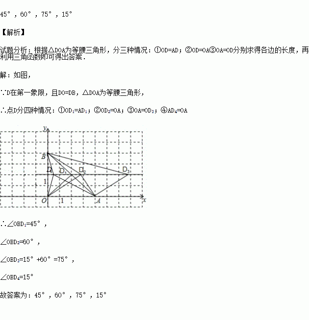 (2015秋•莒南县期末)在平面直角坐标系中,A(4,0),B(0,4),D在第一象限,且DO=DB,△DOA为等腰三角形,则∠OBD的度数为 .