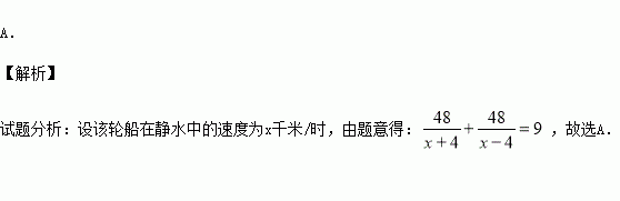 A.B两地相距48千米,一艘轮船从A地顺流航行至B地,又立即从B地逆流返回A地,共用去9小时,已知水流速度为4千米/时,若设该轮船在静水中的速度为x千米/时,则可列方程(