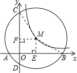分析:过点M作ME⊥x轴,MF⊥y轴,垂足为E、F,连接MB、MC,由垂径定理可知BE=AB=4,故OE=MF=OB-BE=2,设OF=ME=b,则FC=4-b,在Rt△CFM和Rt△BEM中,根据斜边相等,由勾股定理列方程求b,再将M点坐标代入反比例函数式即可.