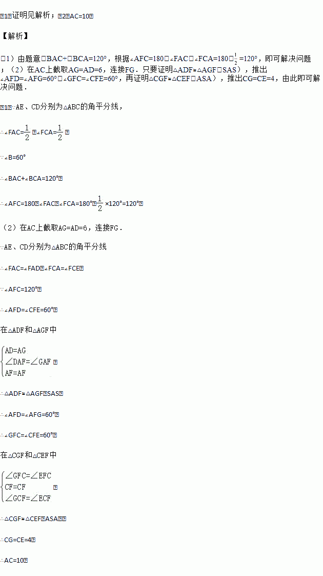 已知:如图,在△ABC中,∠B=60°,D、E分别为AB、BC上的点,且AE、CD交于点F.若AE、CD为△ABC的角平分线.